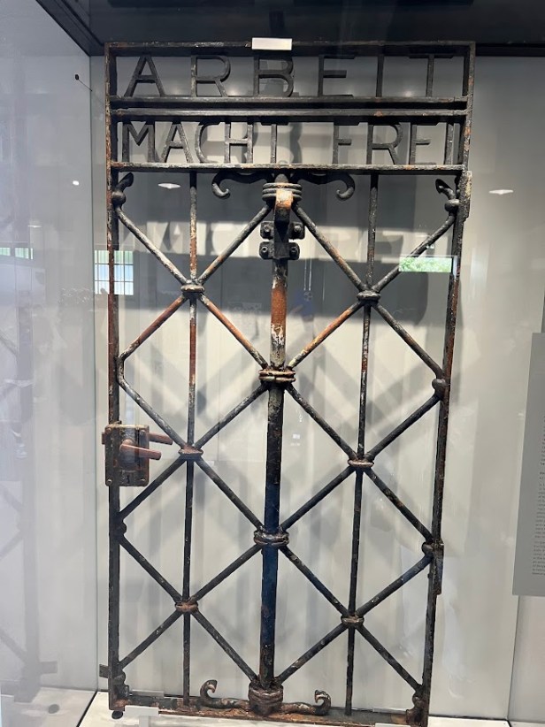 La prima tappa del faticoso viaggio in pullman è stato il lager di Dachau e quando sono entrato mi sono sentito raggelare, bloccato nei movimenti perché visitare dal vivo certi luoghi del terrore, della violenza e dell’annientamento di tutti i diritti umani ha un impatto emotivo fortissimo. Ti colpisce il silenzio che investe tutte le persone appena entrano, come forma di rispetto e di profonda riflessione. Il campo di concentramento di Dachau fu il primo lager nazista inaugurato il 22 marzo 1933 (pochi mesi dall’ascesa al potere di Hitler) e servì da modello per tutti gli altri campi di concentramento, di lavoro forzato e sterminio costruiti successivamente. Nel museo allestito ho visto il cancello di ingresso del campo con la scritta “Arbeit macht frei” che significa “Il lavoro rende liberi”, poi l’elenco di tutti i triangoli che indicavano i vari nemici del regime nazista e tantissime foto a testimoniare l’orrore quotidiano che vivevano i detenuti. Mi hanno davvero impressionato le camere a gas, il forno crematorio e il viale di ingresso con gli alberi piantati da detenuti (oggi altissimi) testimoni di violenza e brutalità.